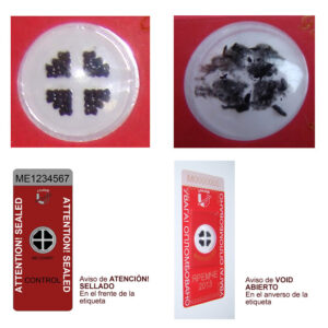 Etiqueta de seguridad Antimagnética, con sistema adhesivo antihurto y partículas en gel que estallan ante la proximidad del imán, elemento usado para vulnerar lectura en medidores de luz, agua y gas.